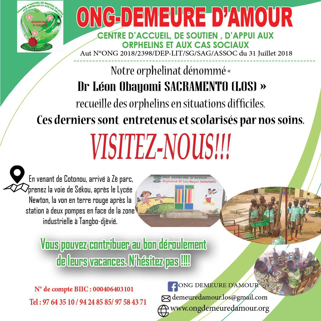 Bonjour et bienvenue sur la plateforme officielle de l'ONG DEMEURE D'AMOUR. ONG Demeure d'Amour est un centre d'accueil, de soutien et d'appui aux orphelins, veuves/veufs, et aux cas sociaux. Son crédo, gaver les autres d'amour.